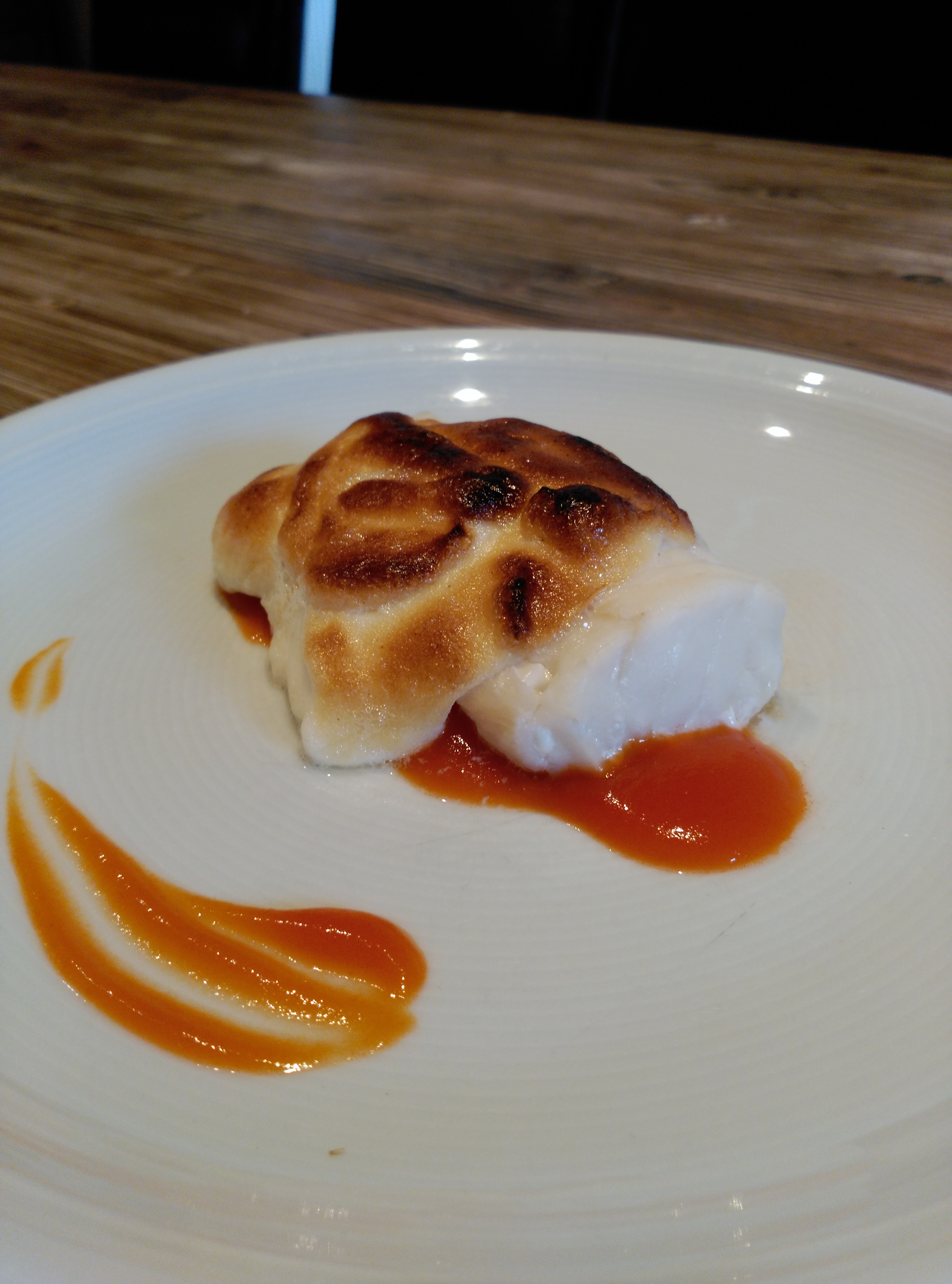 A la hora de servirlo, haremos una cama con salsa de tomate frito en medio del plato. Aconsejo que la cama sea fina y estrecha, ya que al colocar el bacalao encima, se extenderá. Dispondremos el bacalao sobre el tomate frito. Y ya estará listo para comer.