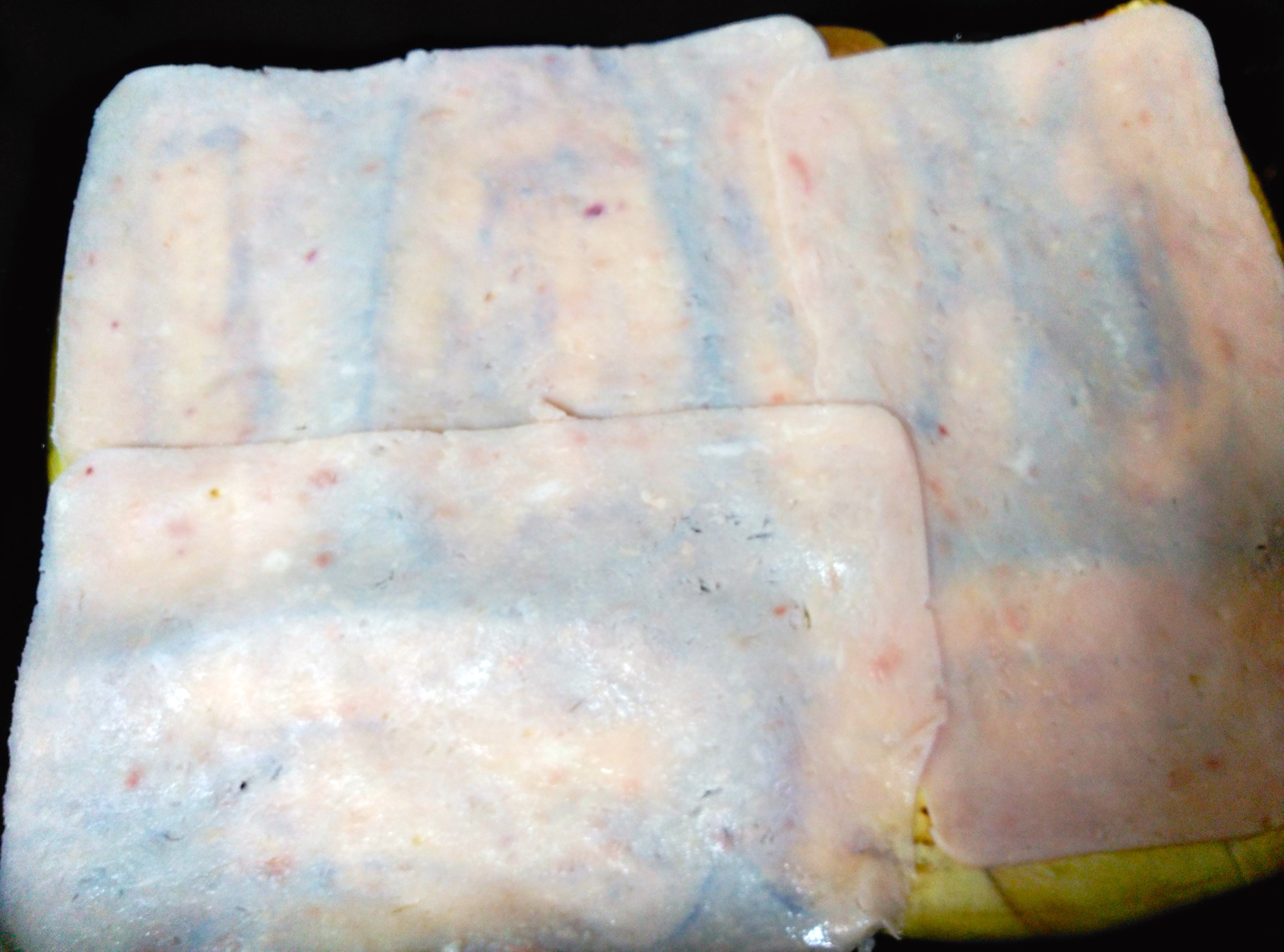 Encima dispondremos, una capa de lonchas de jamón de york, y encima de ésta, otra con lonchas de queso emmental.