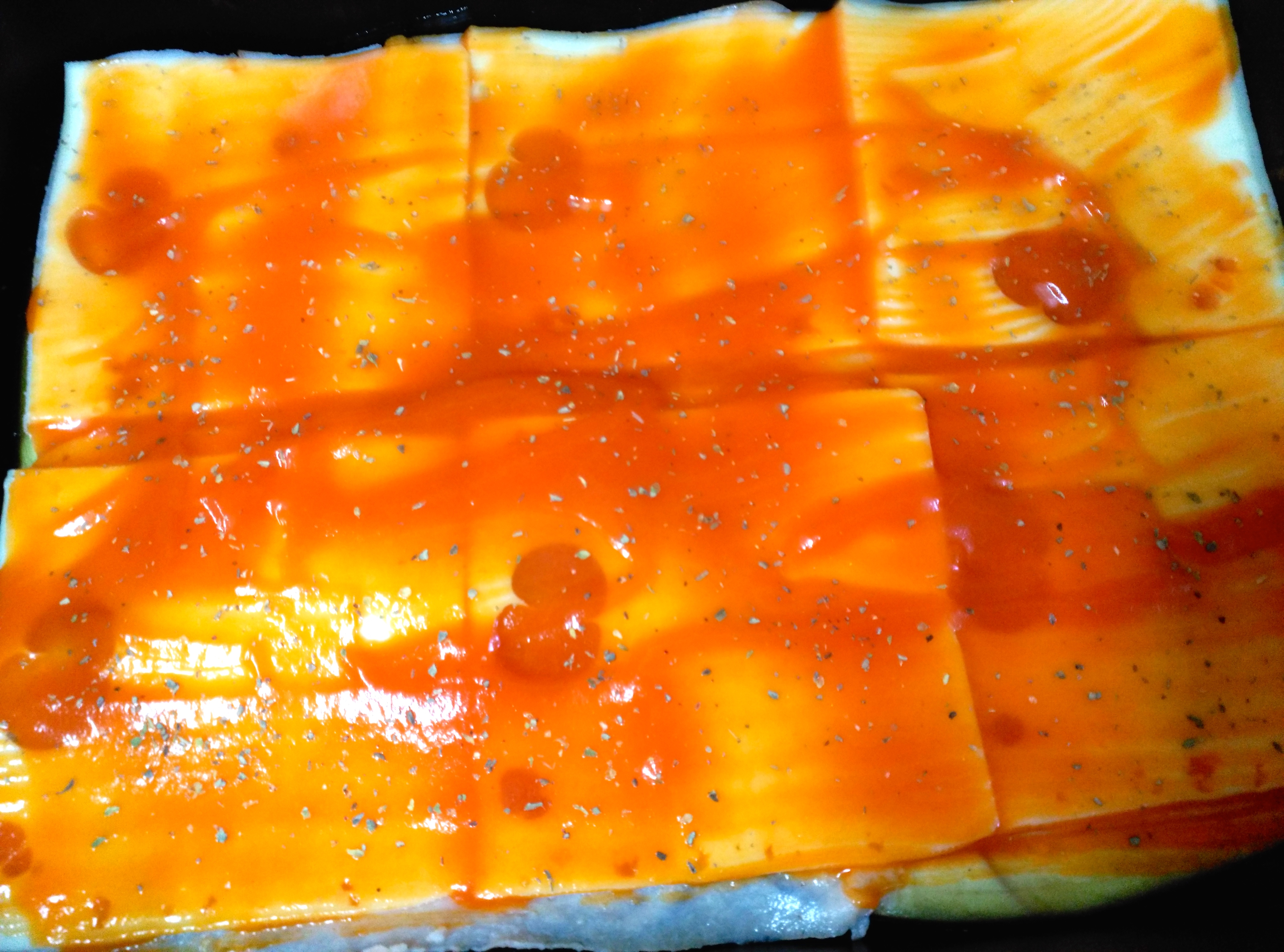 Volveremos a pintar con salsa de tomate frito y espolvorearemos con orégano.