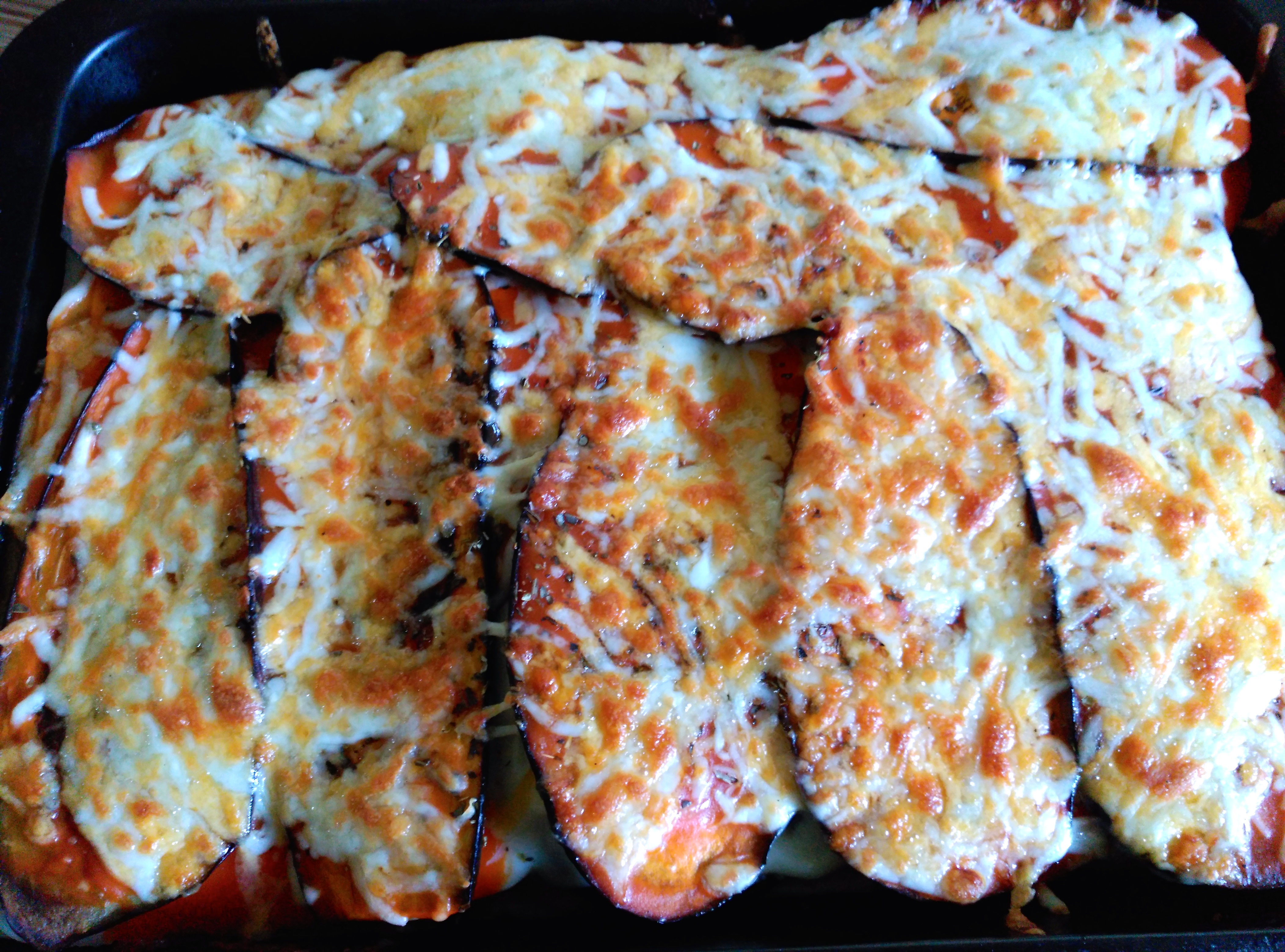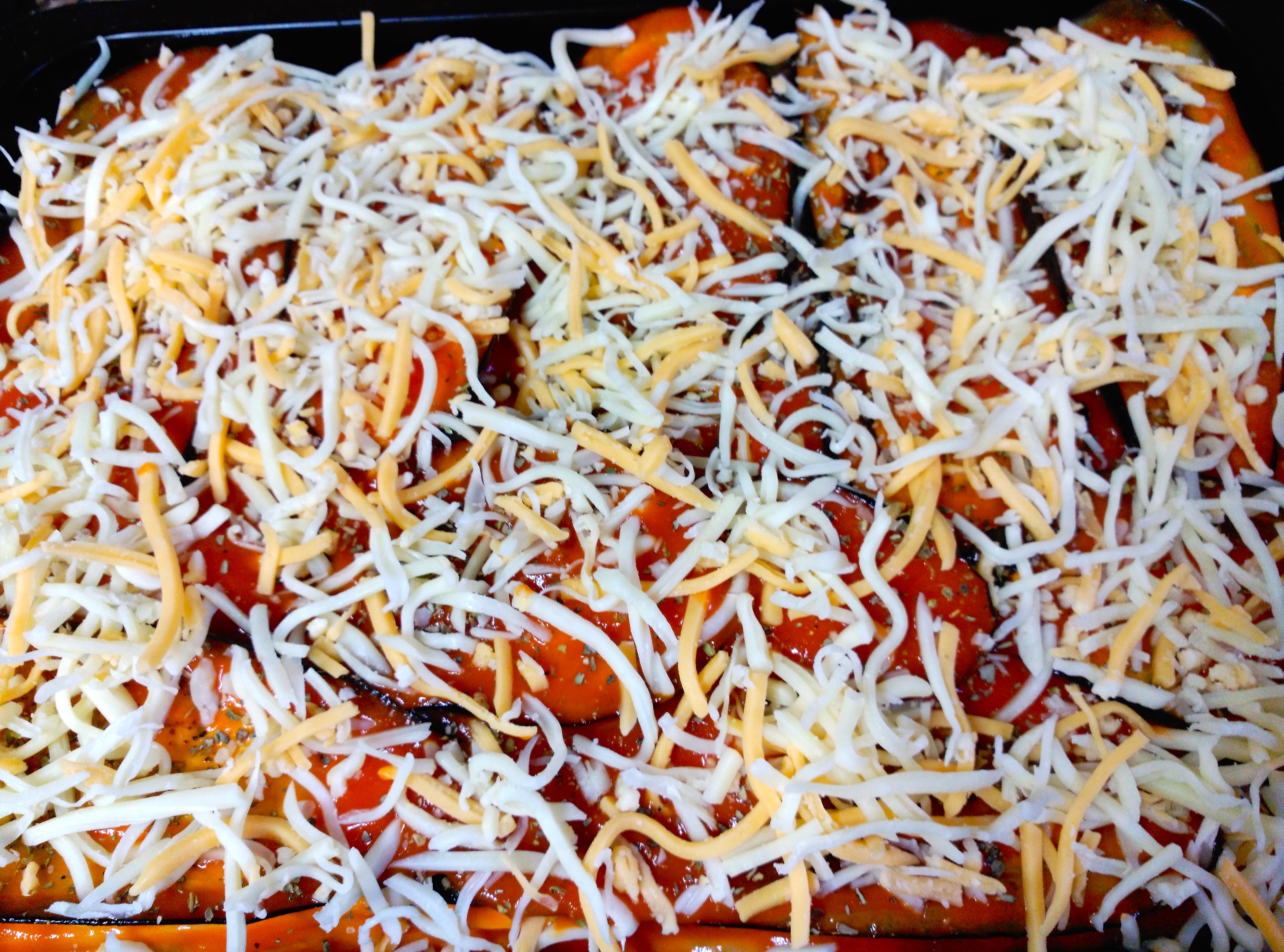 Una vez tengamos los pisos deseados, dejaremos que la última capa sea de berenjenas. Cubriremos con salsa de tomate y orégano. Finalmente, cubriremos con queso rallado para fundir.