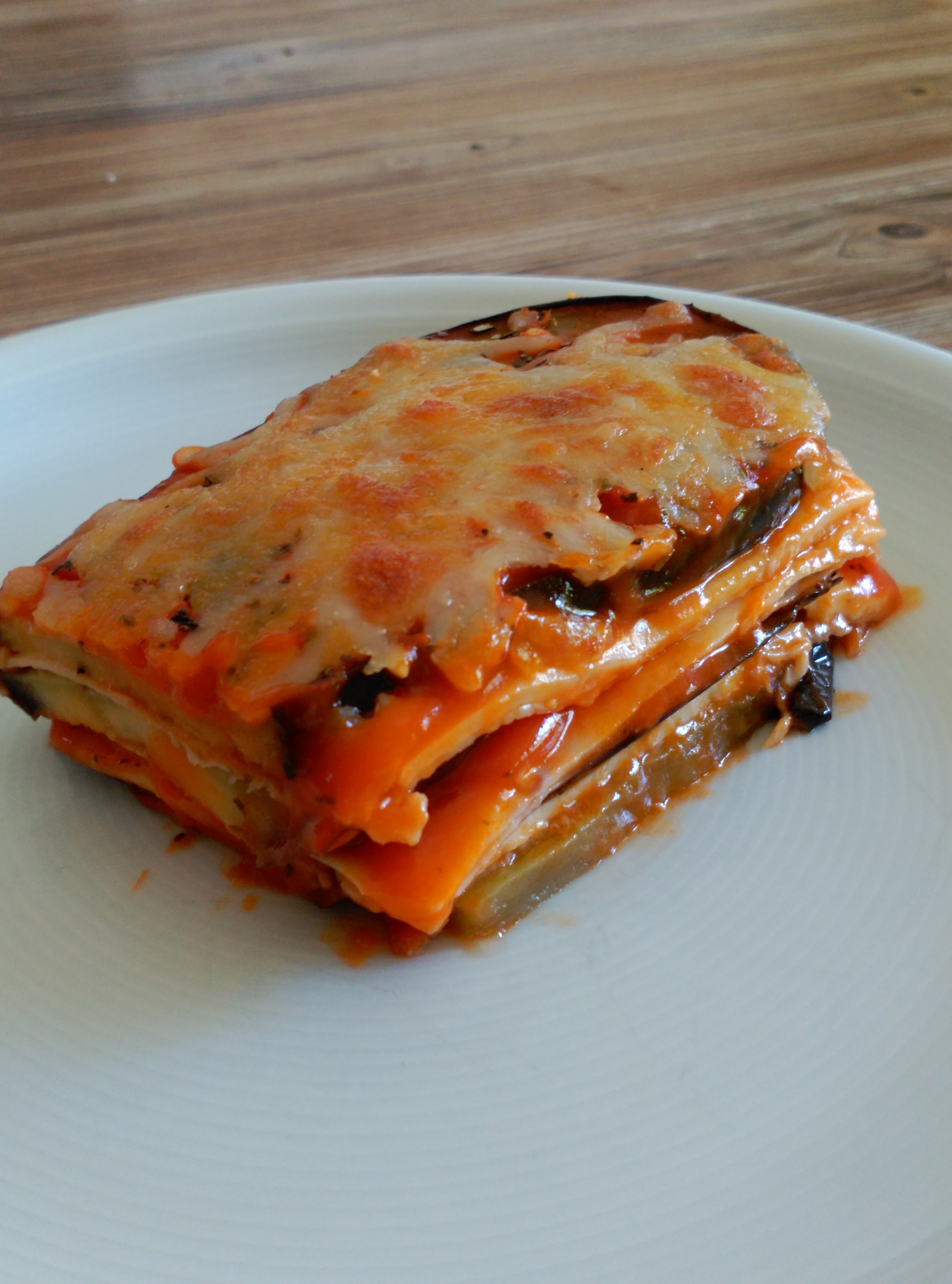 Repetiremos la operación tantas veces como queramos. Esto es, una capa de berenjenas, encima otra de jamón de york, otra de queso emmental y tomate frito con orégano. Yo suelo hacer este plato de tres pisos, pero todo depende del gusto del comensal y de la altura de la fuente elegida.