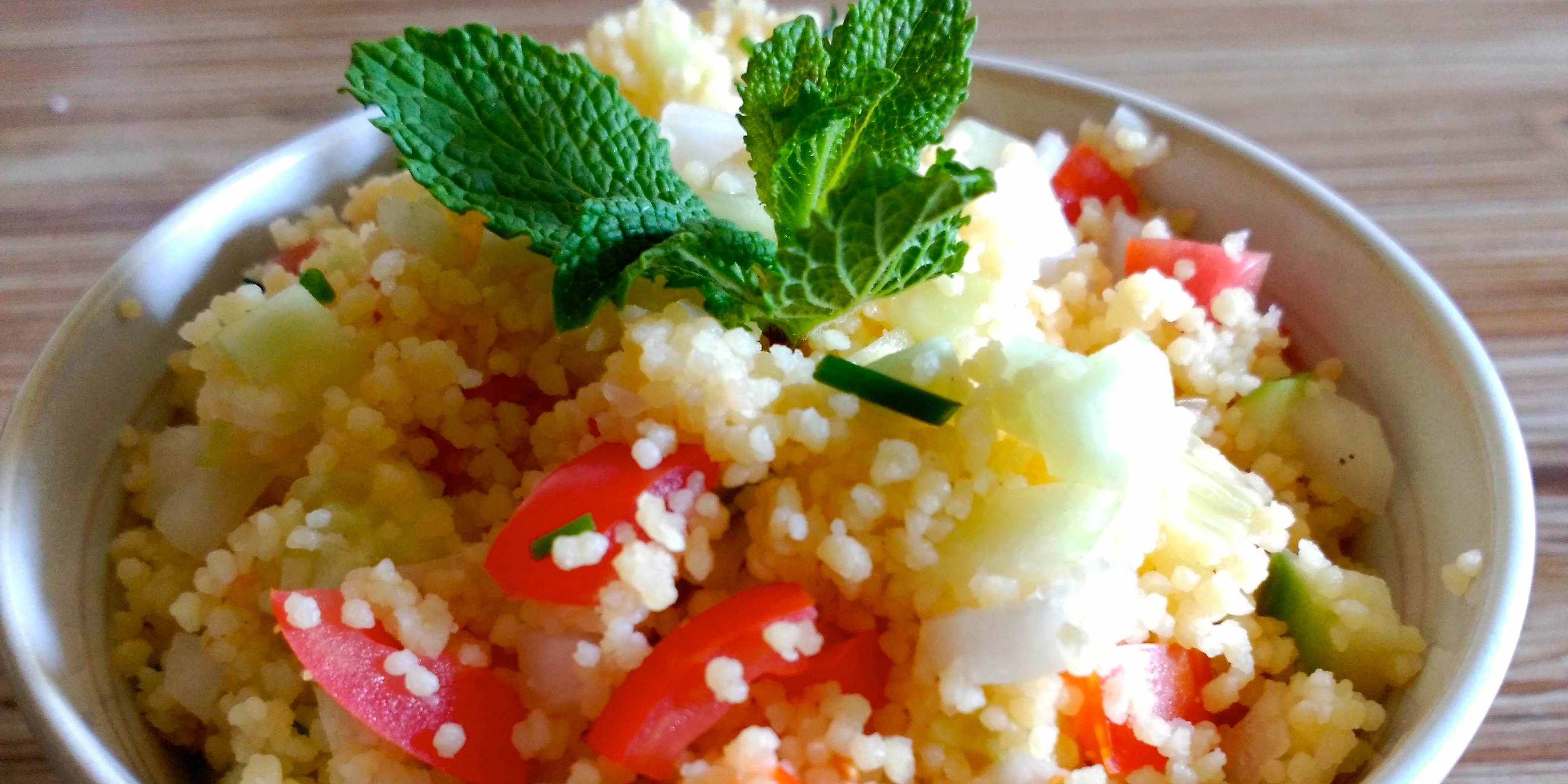 He de reconocer que tardé mucho tiempo en probar el cous–cous. No me atraía en absoluto. Sémola de trigo. Qué aburrimiento. Me recordaba a la sopa de sémola que tomaba cuando era niña, espesa e insípida. Pero un día la curiosidad me pudo y compré un paquete. Me sorprendió gratamente. Me gustó, y desde entonces, de vez en cuando preparo este tabulé. Es una buena combinación de hidratos de carbono y vitaminas de las hortalizas y, por ello, un completo primer plato. Su preparación es rápida y sencilla y el resultado muy sabroso. Vamos a ello.