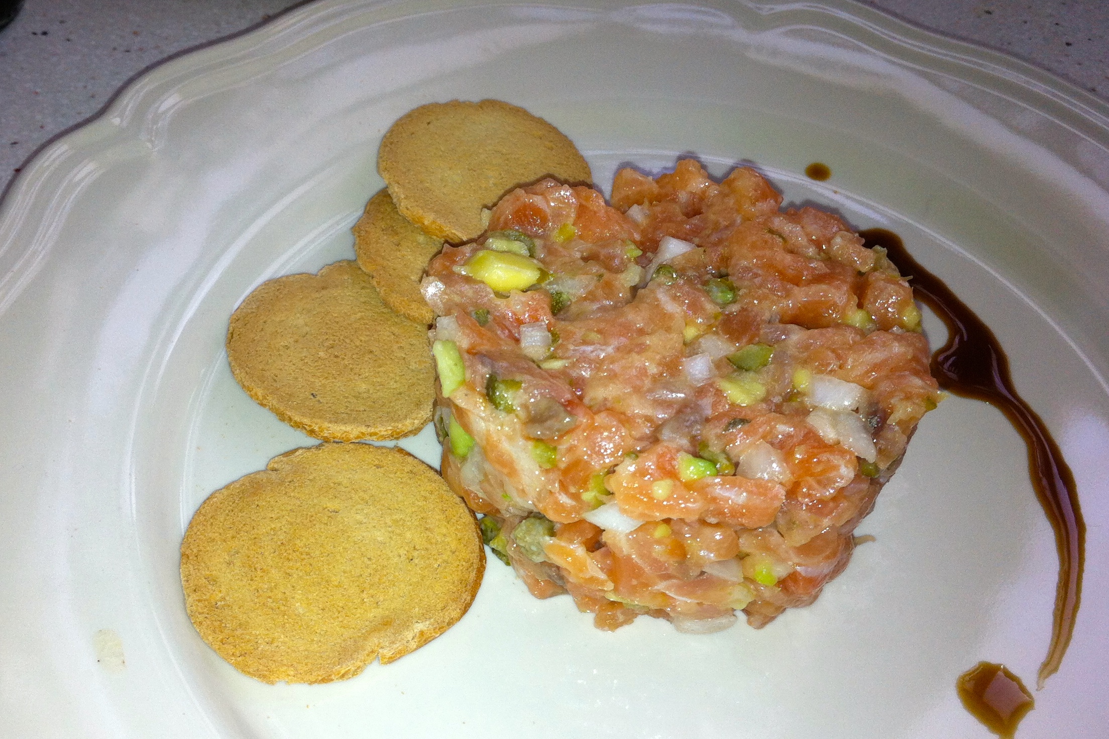 Con un cuchillo bien afilado, cortaremos los lomos de salmón a trocitos muy pequeños. Lo verteremos en un bol, al que iremos incorporando el resto de ingredientes conforme los vayamos picando o troceando. A continuación, picaremos la cebolla tierna muy fina. Picaremos las anchoas (cuyo aceite incorporaremos al bol) y las alcaparras. Cortaremos el aguacate a trocitos muy pequeños y regaremos con el zumo de la lima. Los pepinillos con sabor a anchoa los cortaremos a rodajitas muy finas. Picaremos el cebollino. Pimentaremos al gusto y para finalizar, echaremos unas gotitas de salsa Perrins.