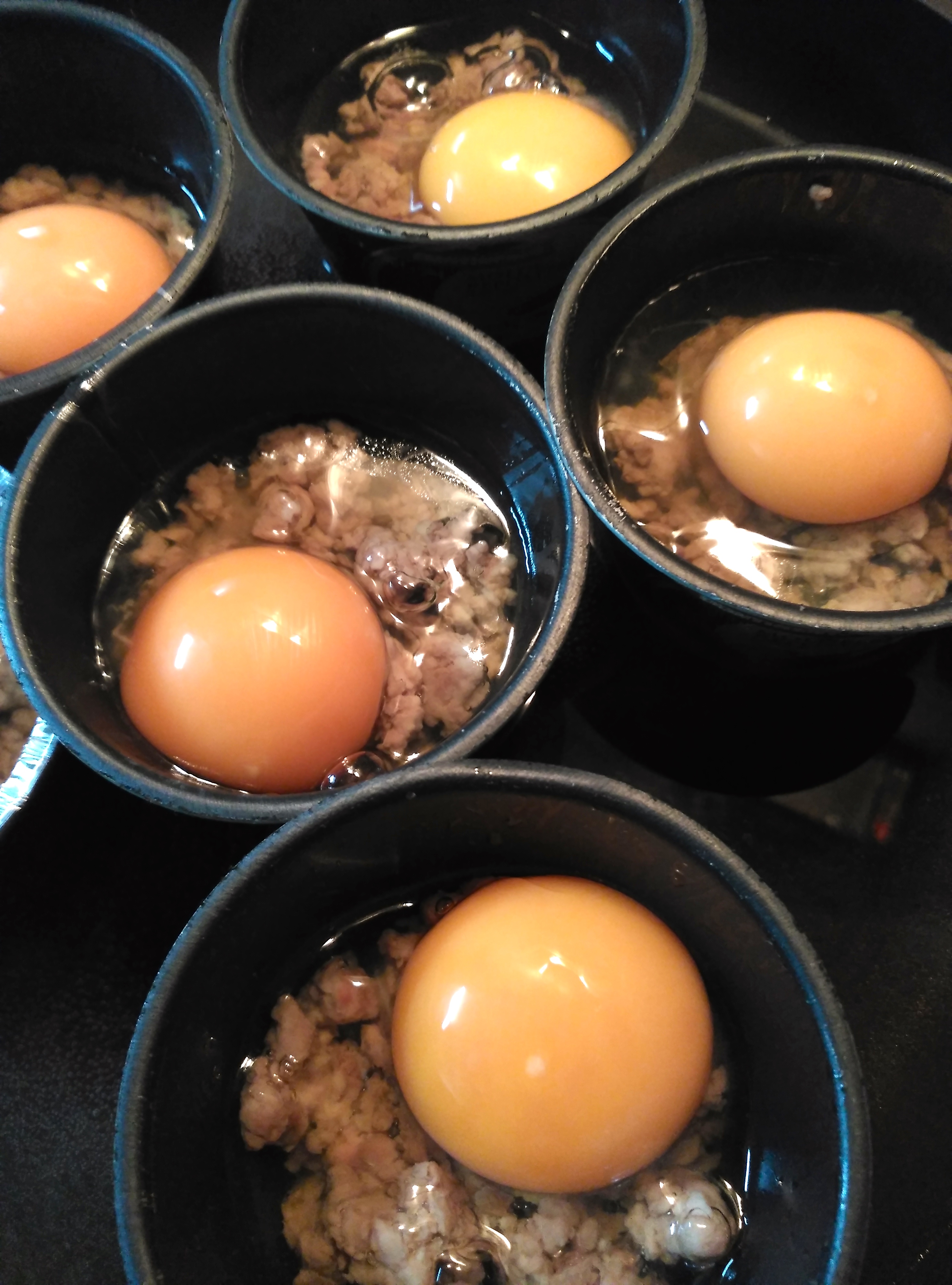 A continuación los pondremos al baño maría. Mejor no hacerlo en el horno ya que se nos cocería demasiado la yema y no nos interesa. Pondremos un poco de agua en una cacerola baja y colocaremos las flaneras dentro. Lo dejaremos al baño maría hasta que la clara haya cuajado. Depende de cada fuego, pero tardará unos 20 o 25 minutos. Controlaremos el fuego para que el agua no salpique y nos entre dentro de la flanera. La clara se hará antes que la yema, lo cual nos interesa, ya que queremos que la yema no cuaje.