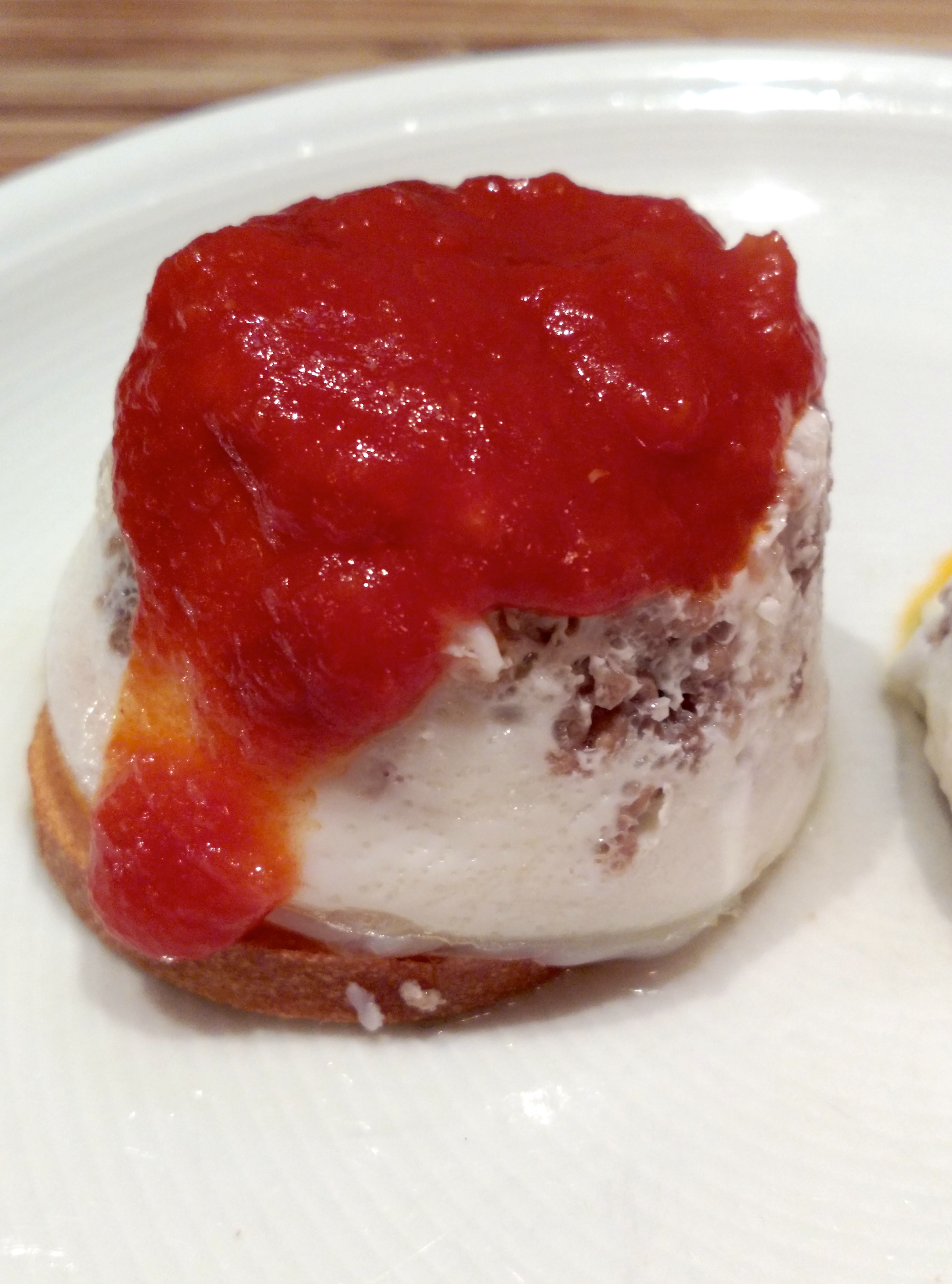 Finalmente, regaremos los flanes de huevo y carne con salsa de tomate frito.
