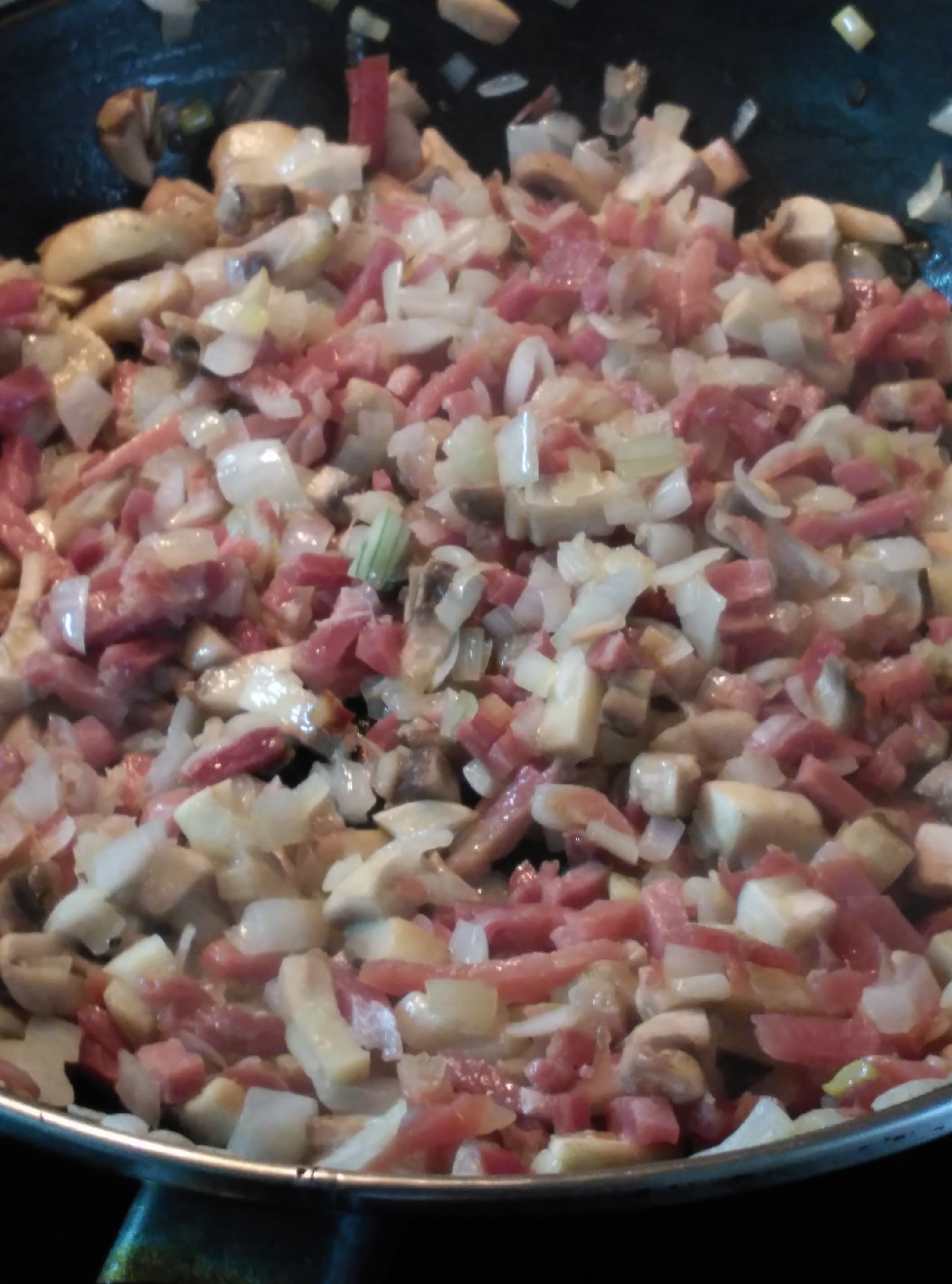 Para empezar, picaremos la cebolla muy fina y la pondremos a rehogar en una sartén antiadherente con un poquito de aceite. Cuando la cebolla esté transparente, añadiremos los champiñones cortados a daditos muy pequeños. Transcurridos cinco minutos, añadiremos los taquitos de jamón serrano. Removeremos bien y lo dejaremos, a fuego lento, cinco minutos más. Yo no suelo salar, ya que el jamón ya es salado y al ponerlo en el fuego, se intensifica su sabor.