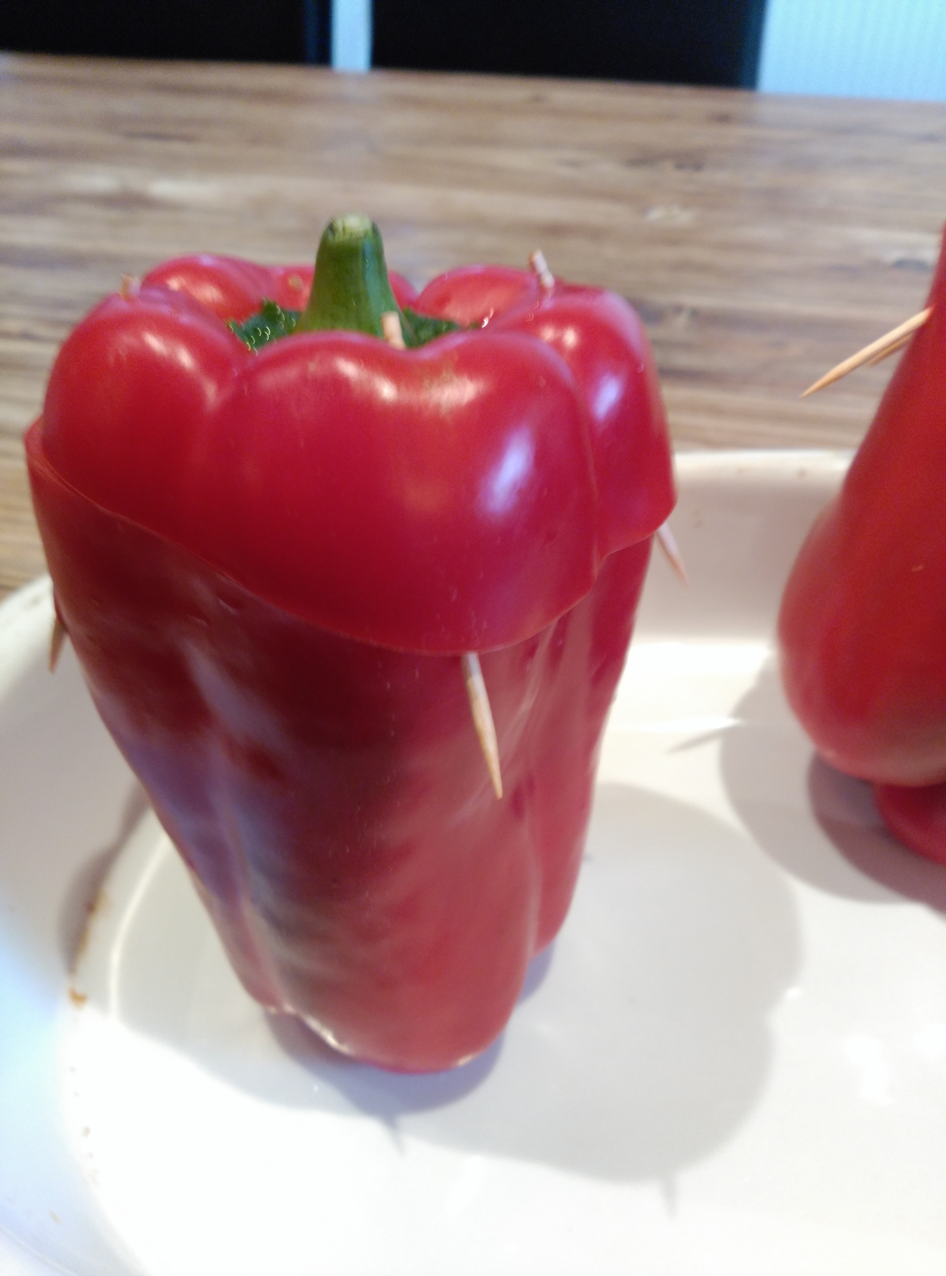 Rellenaremos el pimiento con el arroz y le pondremos el sombrero (esto es, la parte superior que habíamos cortado), intentando encajarla tal y como estaba antes de cortarlo. Lo cerraremos ayudándonos de unos palillos, asegurándonos de que quede bien cerrado para que el arroz se termine de hacer.