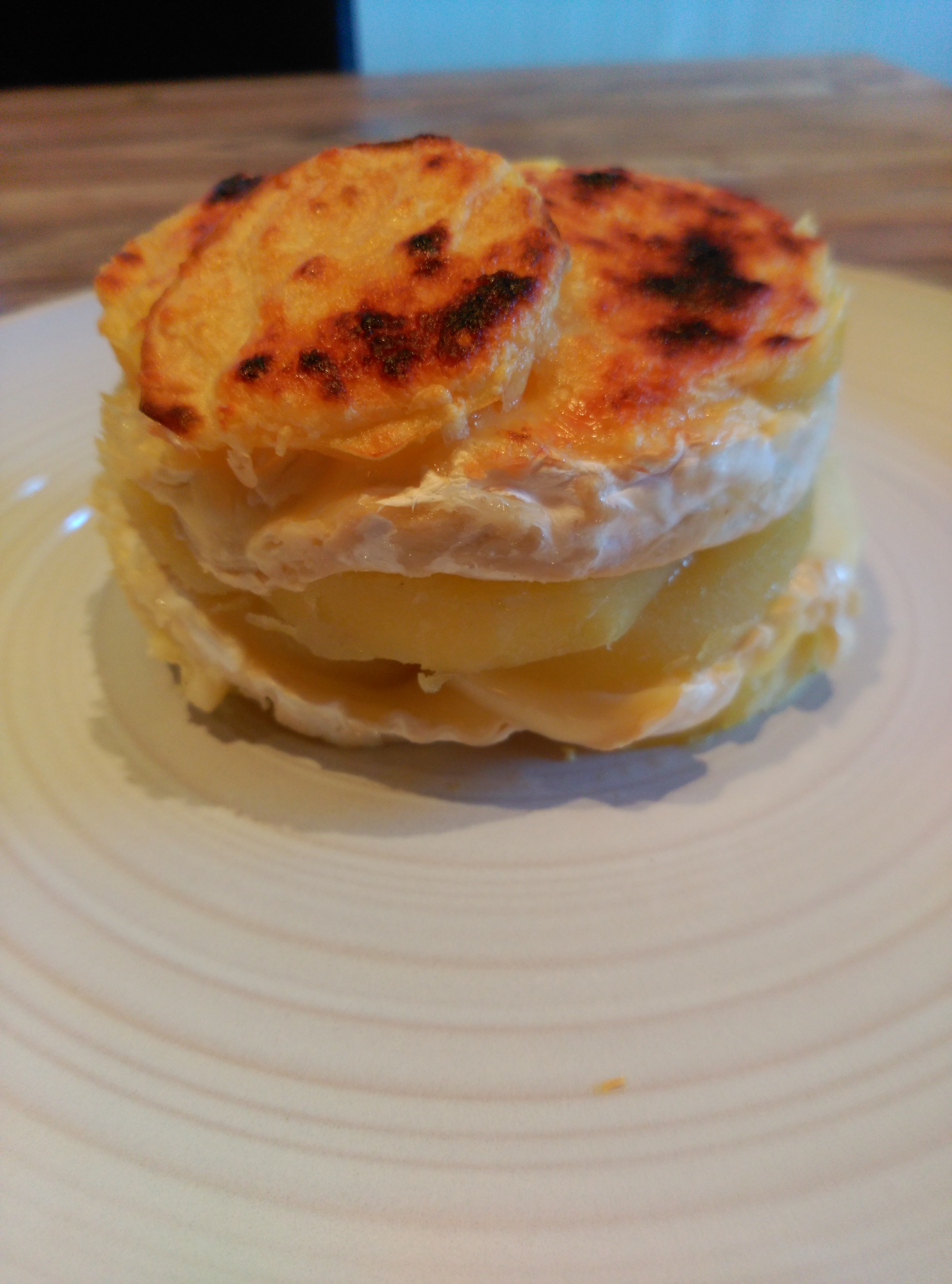 En una fuente apta para el horno, colocaremos tantos aros metálicos como raciones vayamos a preparar y procederemos a rellenarlos. Iremos colocando, por pisos, las láminas de patata y de queso camembert. La última capa será de patata.