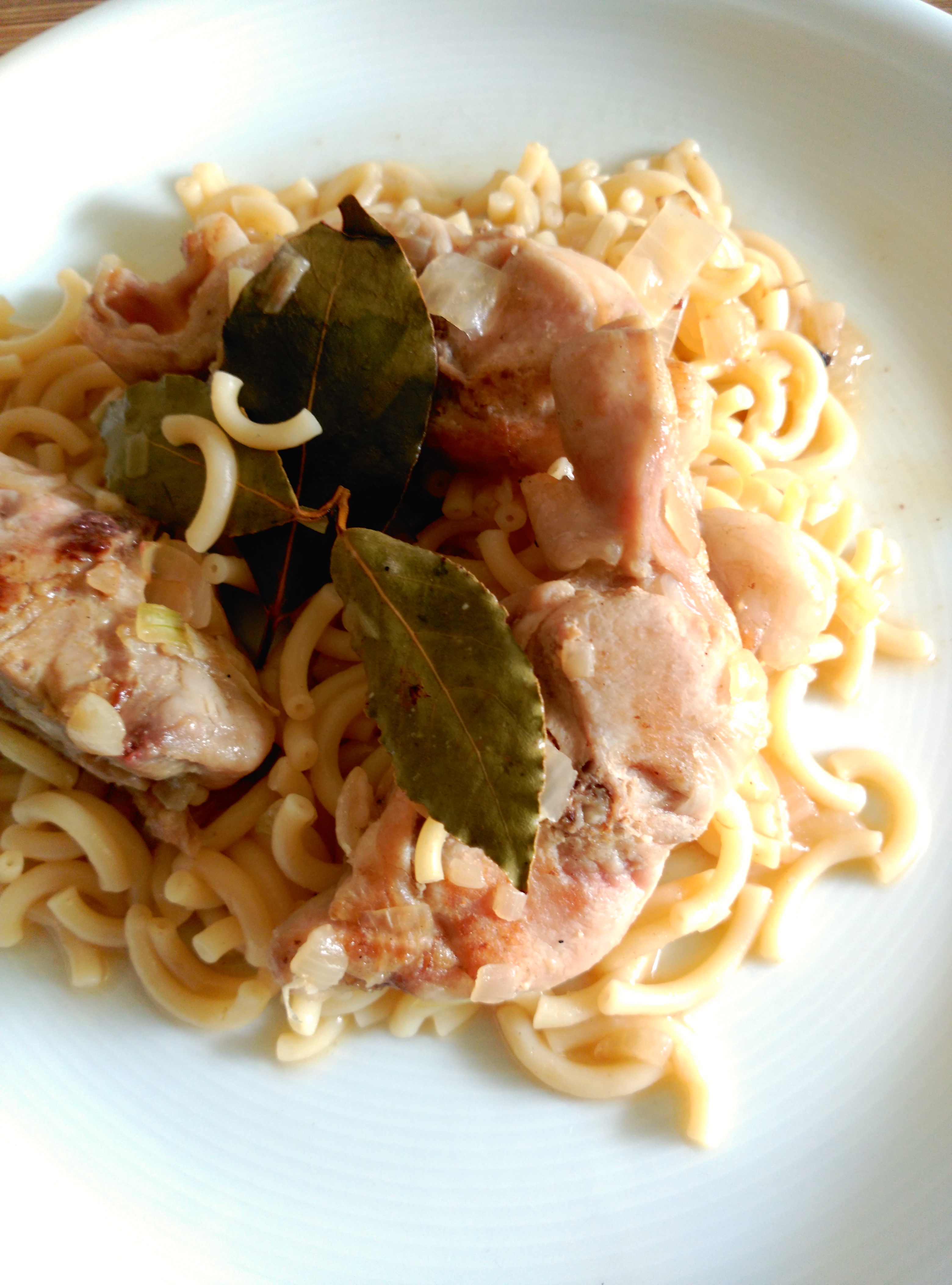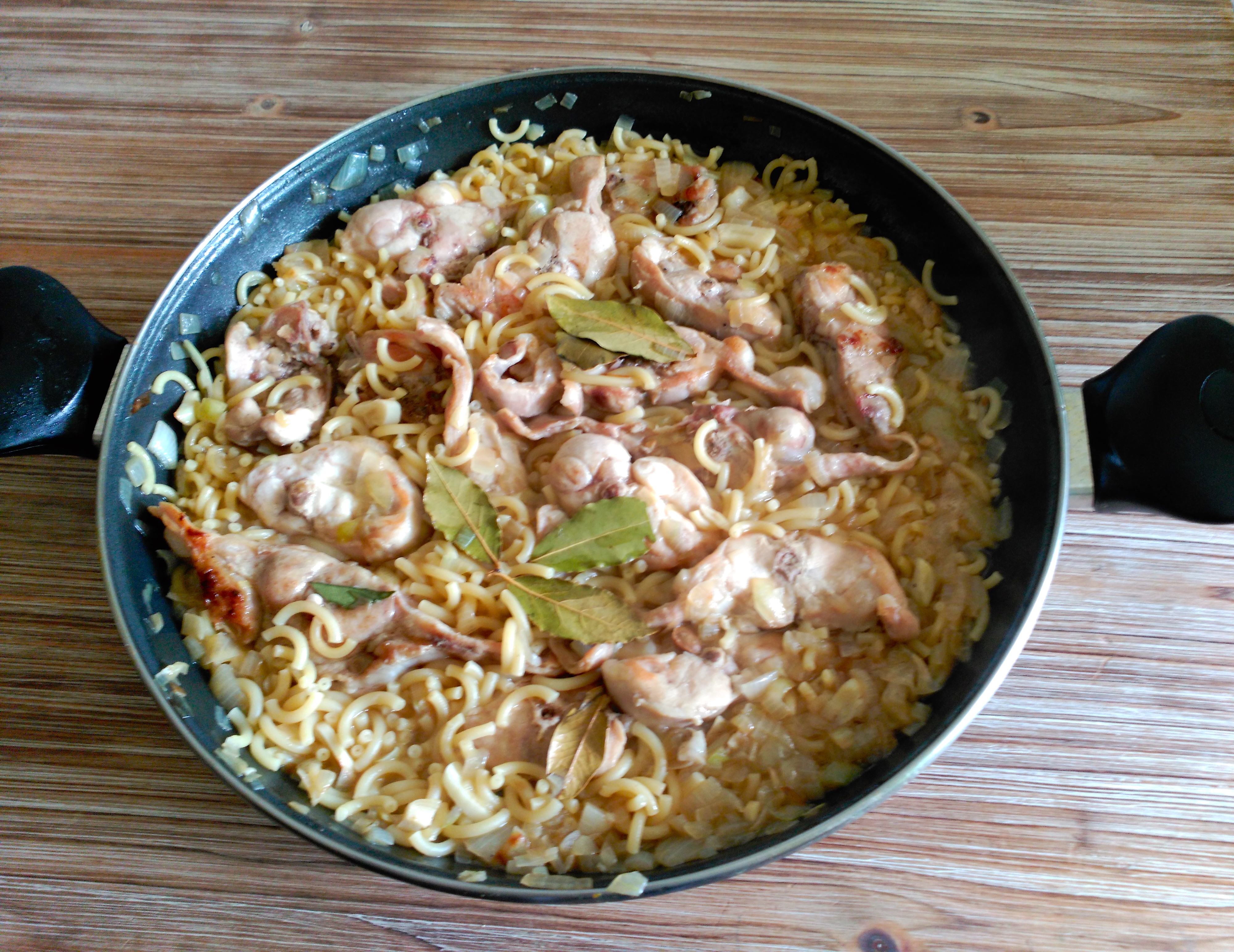 Añadiremos el caldo de verduras hasta cubrir los fideos y el conejo. En este momento, incorporaremos unas hojas de laurel. Removeremos de nuevo.