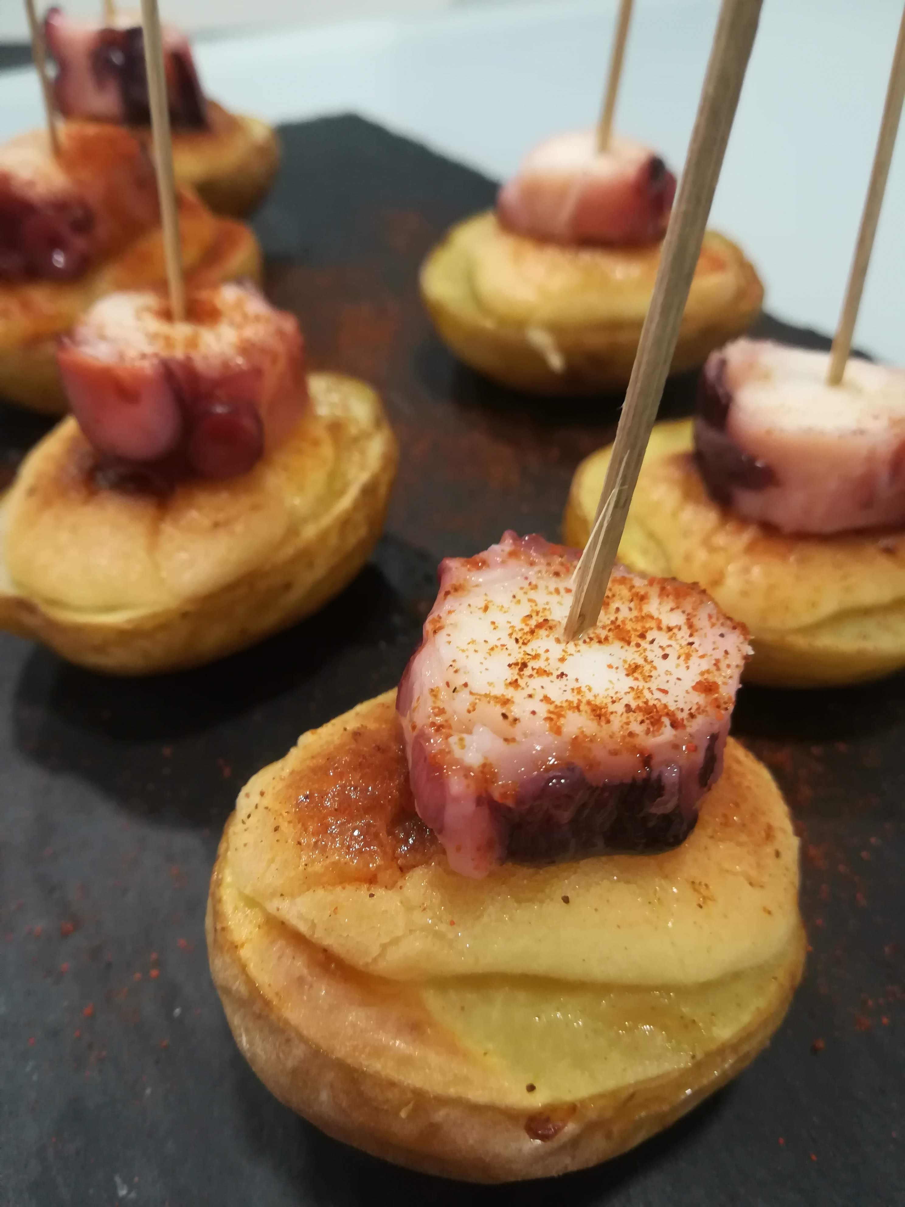 Cortaremos el pulpo en rodajas de 2 cm de grosor y colocaremos una rodaja sobre cada patata.