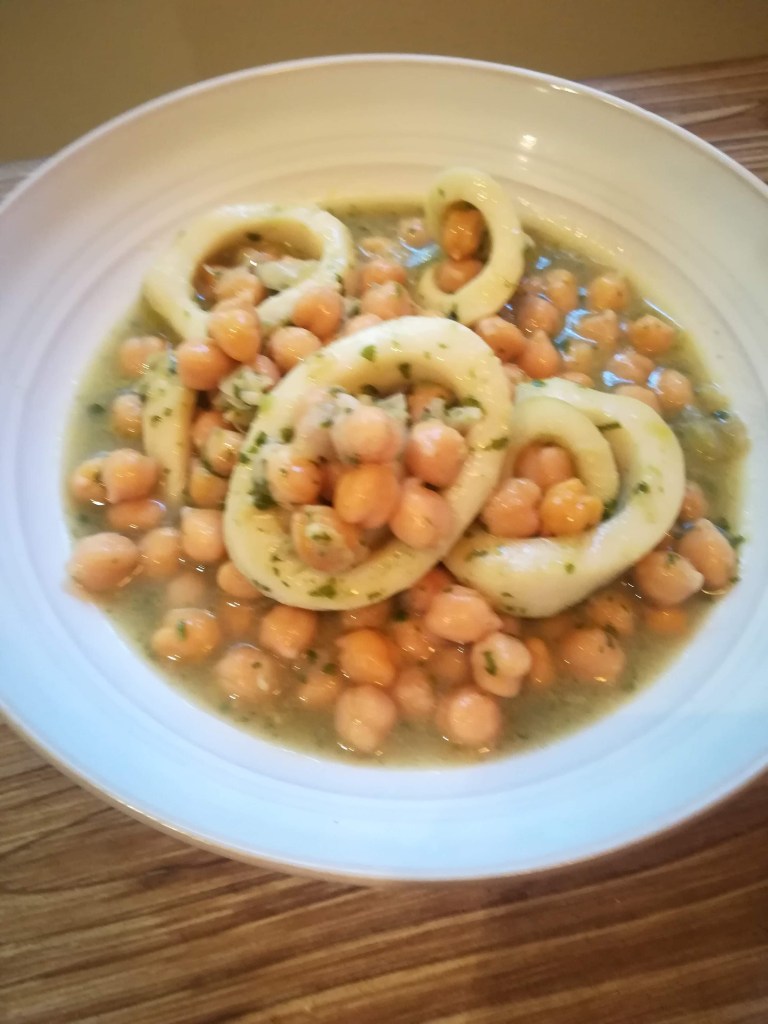 Una vez dorado (sobre todo que no se queme), añadiremos las anillas de calamar. Removeremos bien para que la picada se mezcle con el calamar. Lo dejaremos a fuego vivo unos minutos (hasta que veamos que el calamar ha cambiado de color). En este proceso, el calamar soltará bastante jugo. En cuanto el calamar haya cambiado de color, añdiremos los garbanzos cocidos junto con el jugo de la cocción. En esta ocasión no colaremos los garbanzos.