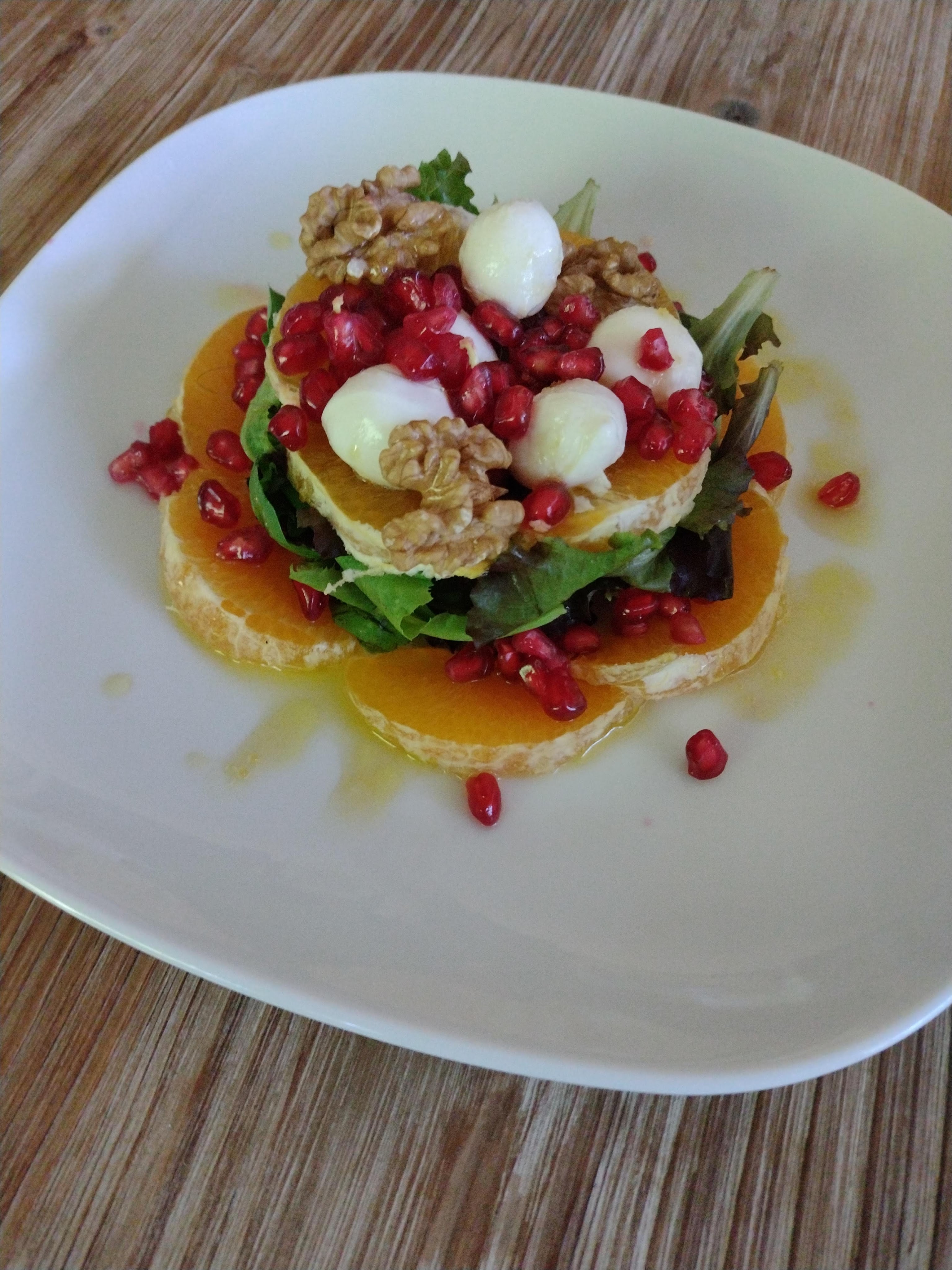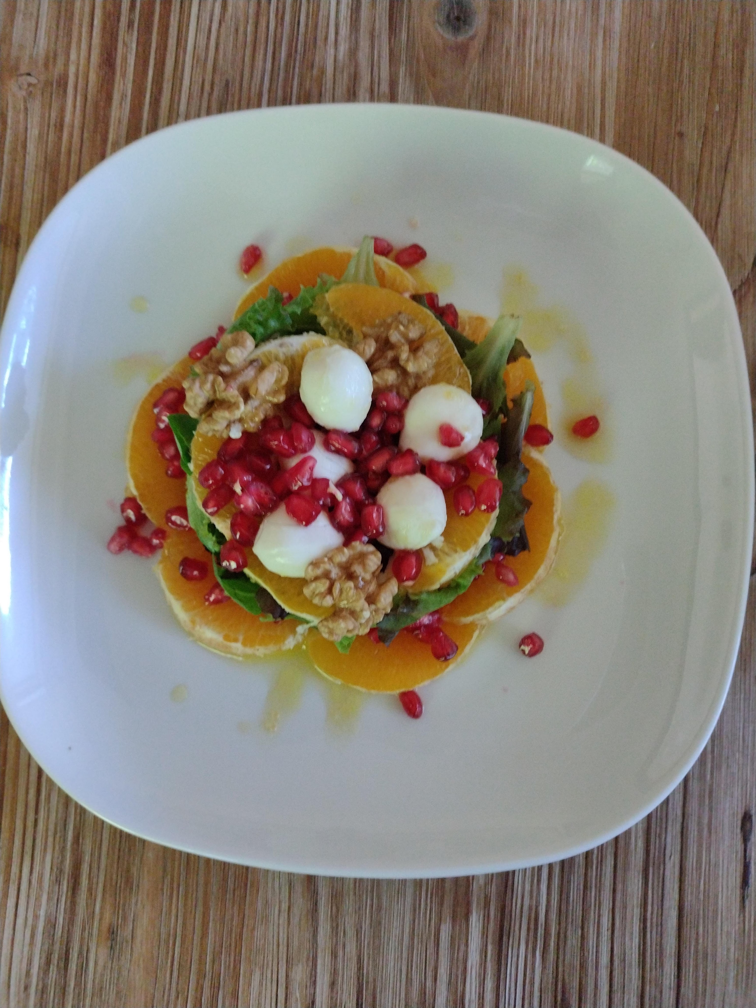 A continuación, vamos a rellenar el aro con los brotes tiernos. Rellenaremos hasta cubrir totalmente el aro y haremos un poquito de presión. Sobre los brotes, colocaremos otra capa de filetes de naranja. A continuación, las bolitas de mozzarella. Sobre el conjunto colocaremos granos de granada al gusto. Por ultimo, unas nueces. Con mucho cuidado, retiraremos el aro.